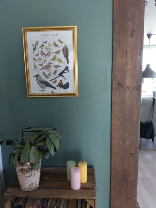 Het is ook veel leuker om niet alles meteen maar nieuw te kopen. Ik werd donateur van WWF en daarbij kreeg je een poster met tuinvogels. Het is daadwerkelijk een mooie poster waarvan ik dacht dat ie in een goudkleurige lijst, prachtig zou staan op de donkere muur. Ik vond een mooie lijst maar nee, ik ga geen 200 kronen + 99 aan verzendkosten betalen.